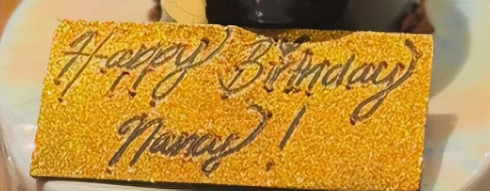 一块黑色镜面巧克力蛋糕,表面贴满金箔,金光闪闪,底下垫盘子都快托不住那股贵气,中间插了个金色牌子写着“Happy Birthday Nancy!”(对,Nancy就是她英文名)。