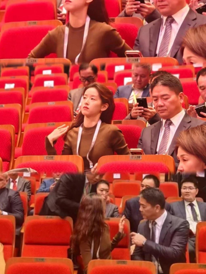 刘强东一身黑色西装神情严肃,章泽天穿棕色毛衣淡妆干练,并排就座时低声交流,会议间隙还俯身耳语,把老刘逗得笑出了褶子。