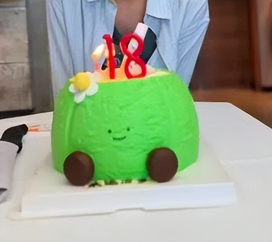 面前摆着个绿色的Jellycat主题蛋糕,上面插着“18”的蜡烛,这是把32岁过成18岁啊,心态也太好了吧。