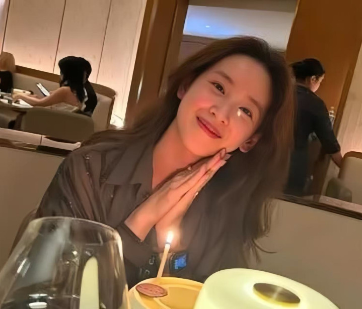 另一张是在餐厅和朋友庆生,穿了件咖色衬衫,化了淡妆,歪着头双手合十,优雅又温柔。