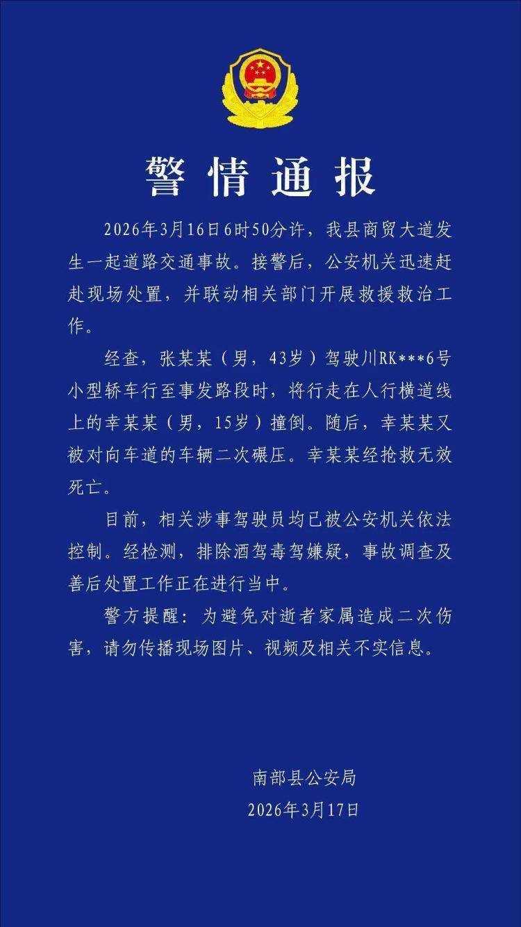 3月17日晚,南部县公安局就此事发布警情通报: