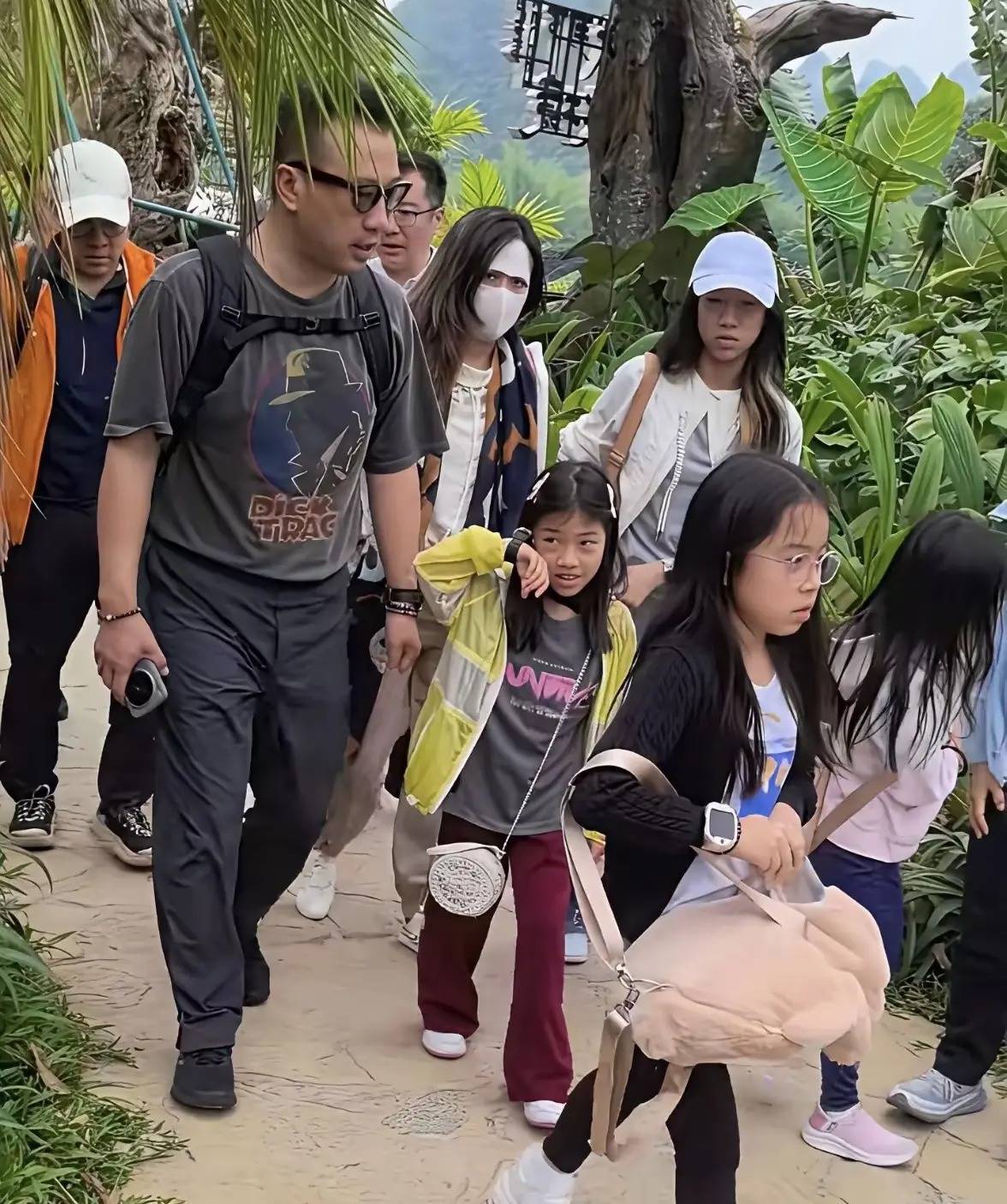 霍启刚带仨娃游广西、这个画面太真实了。当天霍启刚穿了一件橘色外套、戴着白色棒球帽,走在队伍最后、有种快累瘫的感觉!