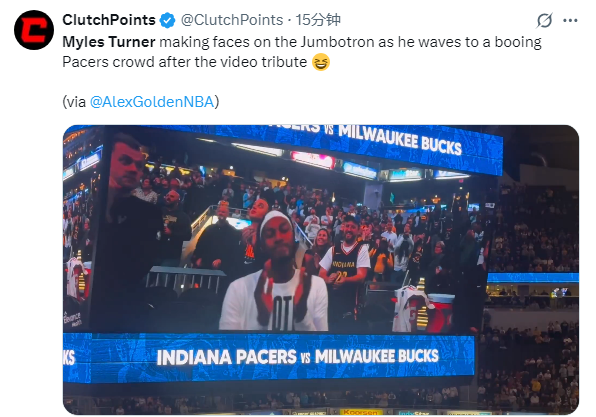 今日,特纳身穿雄鹿球衣回到印第安纳,回到自己征战过10年的球馆,步行者为他播放致敬视频,现场夹杂着欢呼声和嘘声,他在现场做鬼脸回应嘘声。