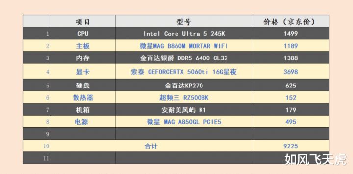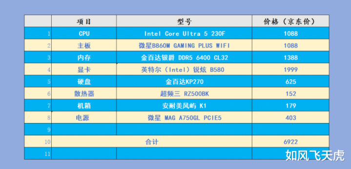 这套配置以英特尔酷睿Ultra 5 230F为核心,搭配微星B860M GAMING PLUS WIFI主板,全方位支持2K游戏体验和生产力。在内存价格飞涨的今天,依旧可以将总价(按京东价格计)控制在7K以下,性价比很高。