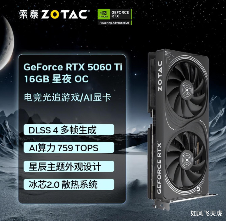 显卡选择索泰 GEFORCERTX 5060ti 16G星夜,它采用NVIDIA Blackwell架构,4608个CUDA核心,核心频率可达2587MHz。显存规格是16GB GDDR7显存,支持4K分辨率输出。星漩散热系统实现良好散热效果,单8PIN外接电源接口通用型更强。它具有第五代Tensor Core,借助FP4和DLSS4,提供强劲AI性能。通过DLSS4集成多帧生成技术提升图形和性能,通过NVIDIA Reflex 2提升响应速度,在全景光线追踪方面更是具有优势,无论是游戏还是生产力,包括最新的AI应用方面是得心应手。