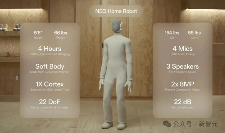 在硬件方面,Neo高5.5英尺(167厘米),重66磅(30公斤),可连续运行4小时后再充电。